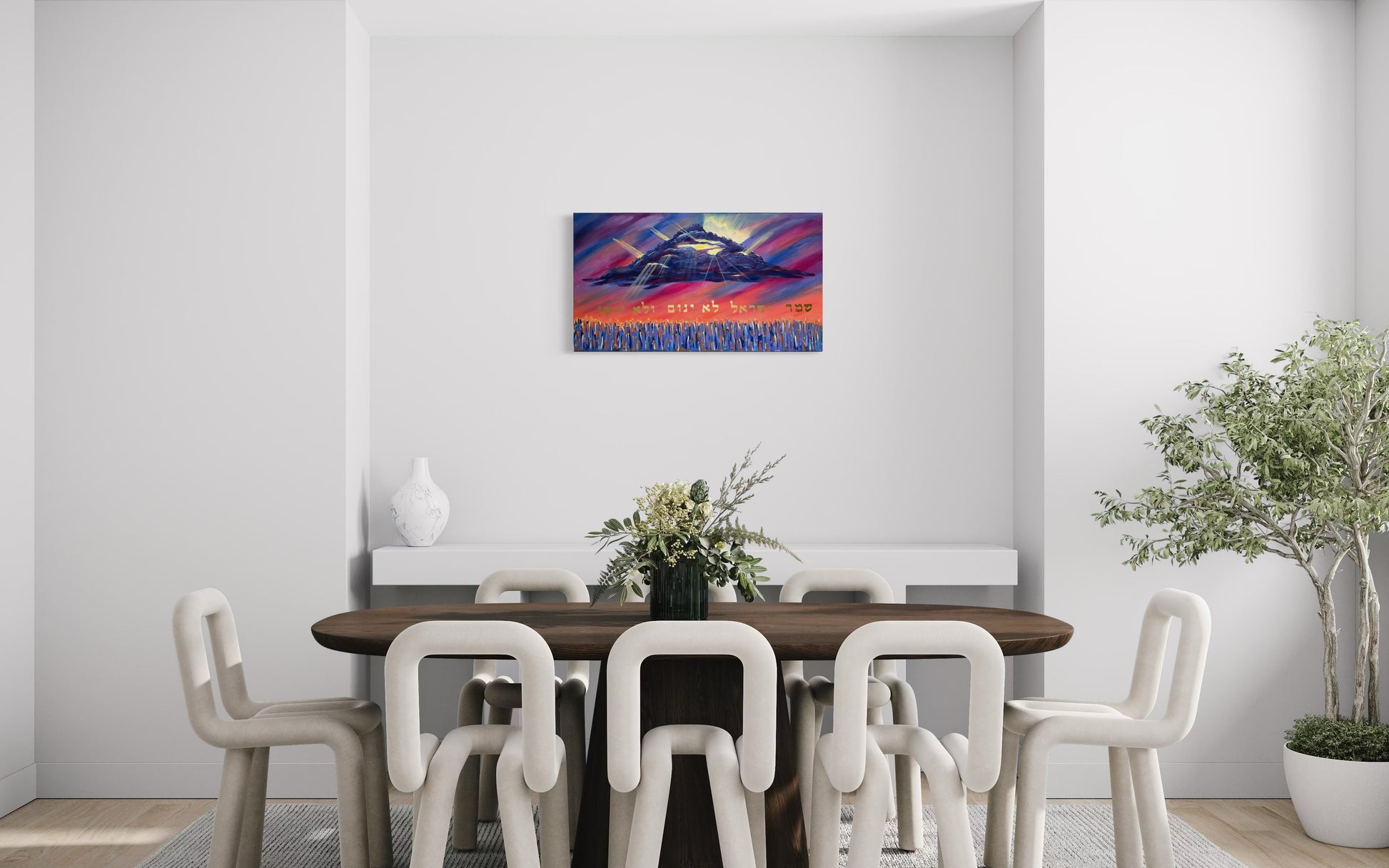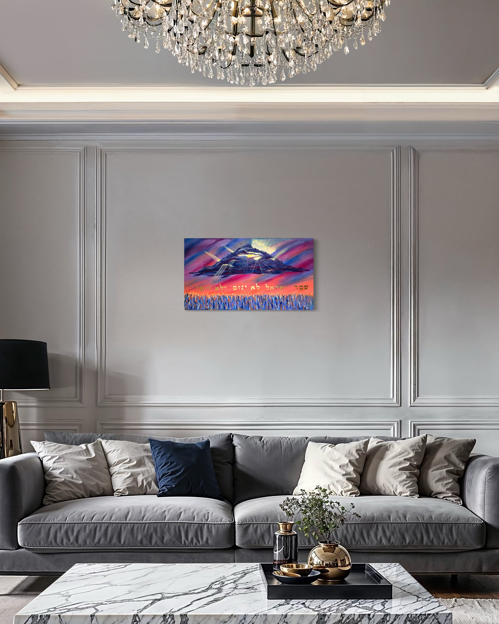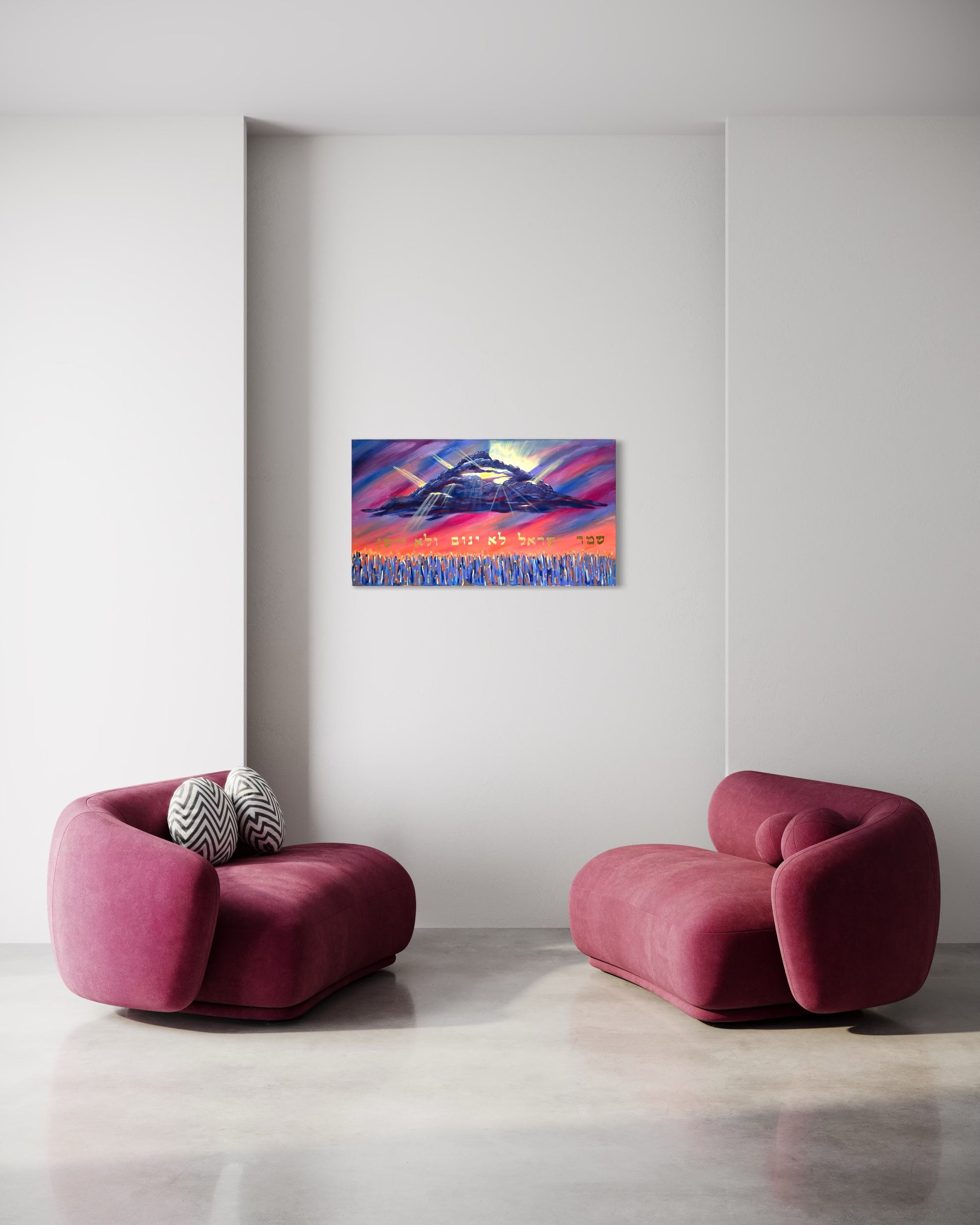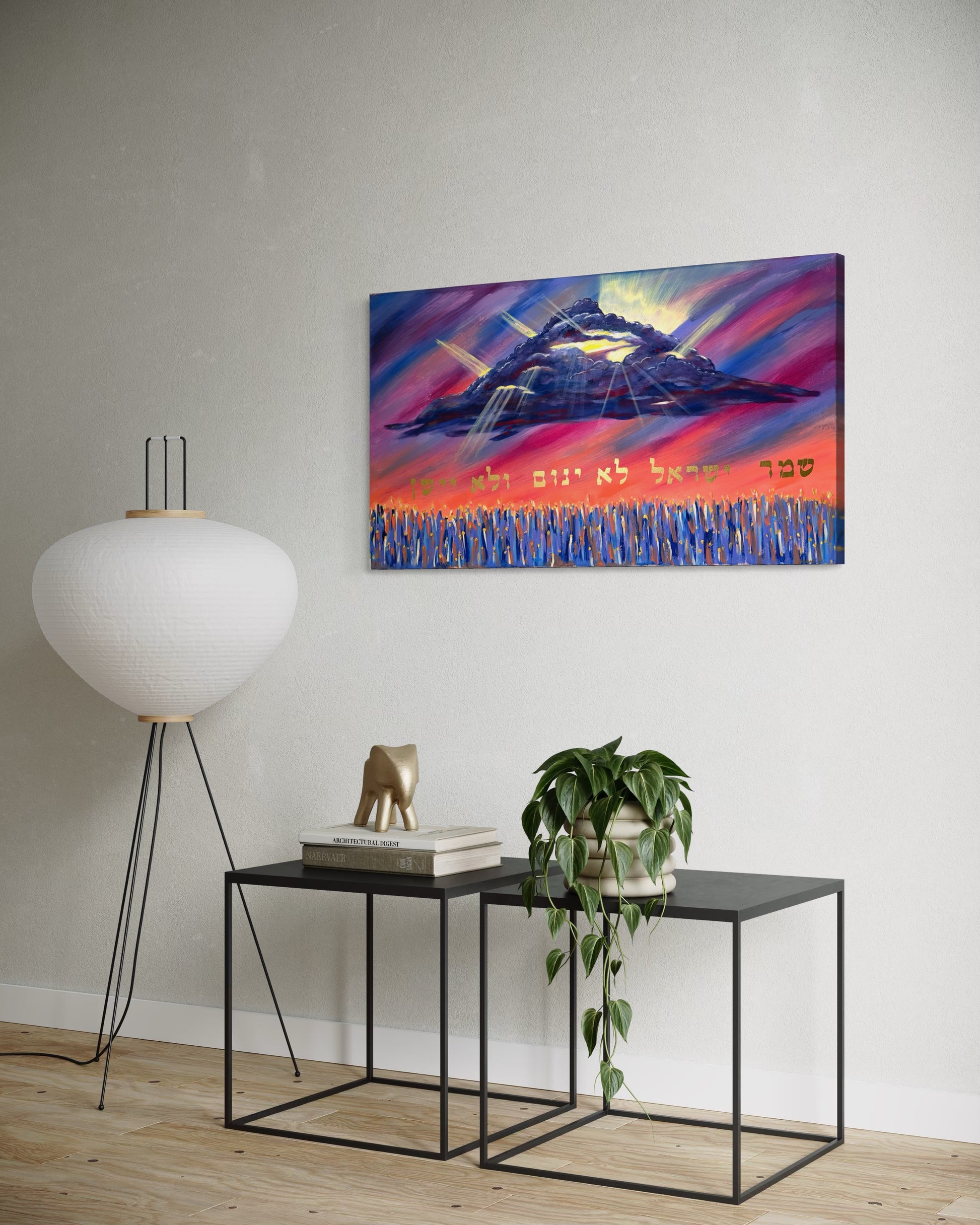 "The Guardian of Israel neither slumbers nor sleeps." A radiant sky and watchful clouded form symbolize constant divine protection over the nation. Below, a gathered people stand united, bathed in light and color, reflecting faith, resilience, and continuity.